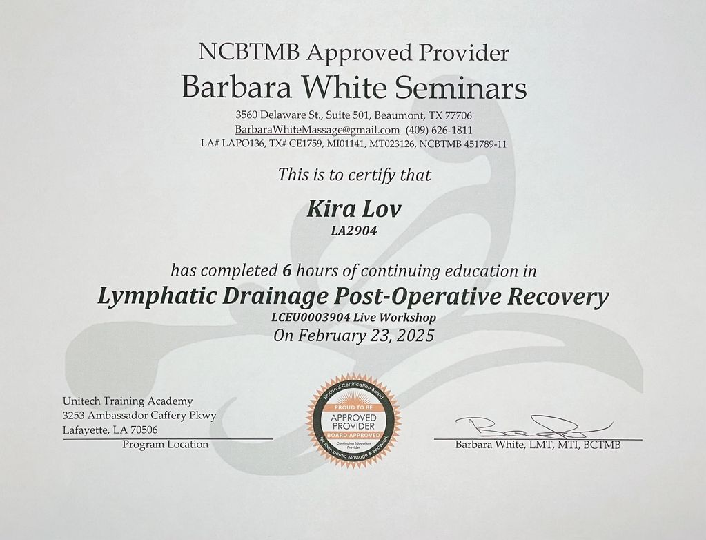 My practice is focused on helping clients improve their overall well-being, accelerate recovery after surgery, and reduce swelling and discomfort through targeted techniques. I work closely with individuals recovering from cosmetic procedures, medical surgeries, or those dealing with chronic conditions, to support healing and restore balance to the body.